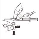 Tenez la seringue DROITE. De l’autre main, tirez le capuchon de l’aiguille vers le haut. Appuyez sur le piston pour évacuer l’air de la seringue. La seringue contenant le produit est prête pour une administration immédiate.