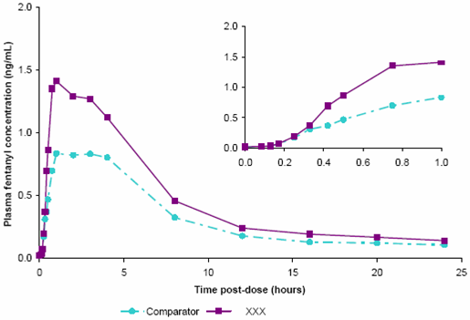 Concentrations plasmatiques moyennes en fentanyl en fonction du temps (24 heures et première heure uniquement [graphe en haut et à droite]) après des doses uniques de 800 microgrammes de BREAKYL ou de 800 microgrammes d’un produit de comparaison (fentanyl comprimé avec applicateur buccal) chez des volontaires sains.