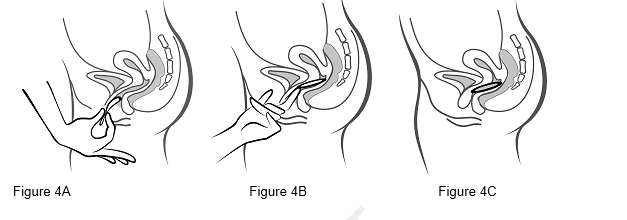 Insérez l'anneau dans le vagin avec une main (Figure 4A), en écartant les lèvres à l'aide de l'autre main si nécessaire. Poussez l'anneau dans le vagin jusqu'à ce qu'aucune gêne ne soit perçue (Figure 4B). Laissez l'anneau en place pendant 3 semaines (Figure 4C).