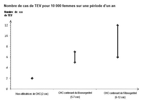 · On estime que sur 10 000 femmes qui utilisent un CHC faiblement dosé contenant du lévonorgestrel, environ 6[1] développeront une TEV sur une période d’un an. Des résultats contradictoires ont été obtenus concernant le risque de TEV associé à Etonogestrel/ Ethinylestradiol en comparaison aux CHC contenant du lévonorgestrel (avec des estimations du risque relatif allant d’une absence d’augmentation [RR = 0,96] à un risque pratiquement multiplié par 2 [RR = 1,90]). Ceci correspond à environ 6 à 12 cas de TEV par an pour 10 000 femmes utilisant l’anneau contenant Etonogestrel/ Ethinylestradiol.