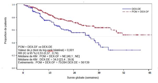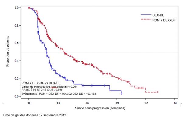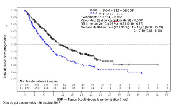 Le traitement par le pomalidomide en association avec le bortézomib et la dexaméthasone doit être poursuivi jusqu’à la progression de la maladie ou l’apparition d’une toxicité inacceptable.