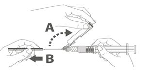Étape 4 : A : soulever le bouclier de sécurité en l’écartant de l’aiguille et en le poussant vers le corps de la seringue selon l’angle indiqué. B : Retirez le protège-aiguille en tirant tout droit. |