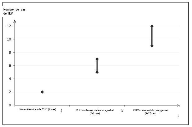 On estime1 que sur 10 000 femmes qui utilisent un CHC contenant du désogestrel, 9 à 12 développeront une TEV sur une période d’un an ; ce nombre est à comparer à celui d’environ 62 chez les femmes qui utilisent un CHC contenant du lévonorgestrel.