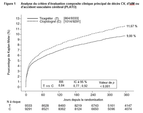 Le ticagrélor aux deux posologies de 60 mg deux fois par jour et de 90 mg deux fois par jour en association avec l’AAS a été supérieur à l’AAS en monothérapie dans la prévention des événements athérothrombotiques (critère d’évaluation composite : décès CV, IdM et AVC), avec un effet constant du traitement sur la totalité de la période d’étude, engendrant une RRR de 16 % et une RRA de 1,27 % pour le ticagrélor 60 mg, et une RRR de 15 % et une RRA de 1,19 % pour le ticagrélor 90 mg.