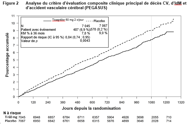 Comparativement à l’AAS en monothérapie, l’administration de ticagrélor 60 mg deux fois par jour a significativement réduit le critère d’évaluation composite principal de décès CV, d’IdM et d’AVC. Chacune des composantes a contribué à la réduction du critère d’évaluation composite principal (décès CV RRR 17 %, IdM RRR 16 % et AVC RRR 25 %).